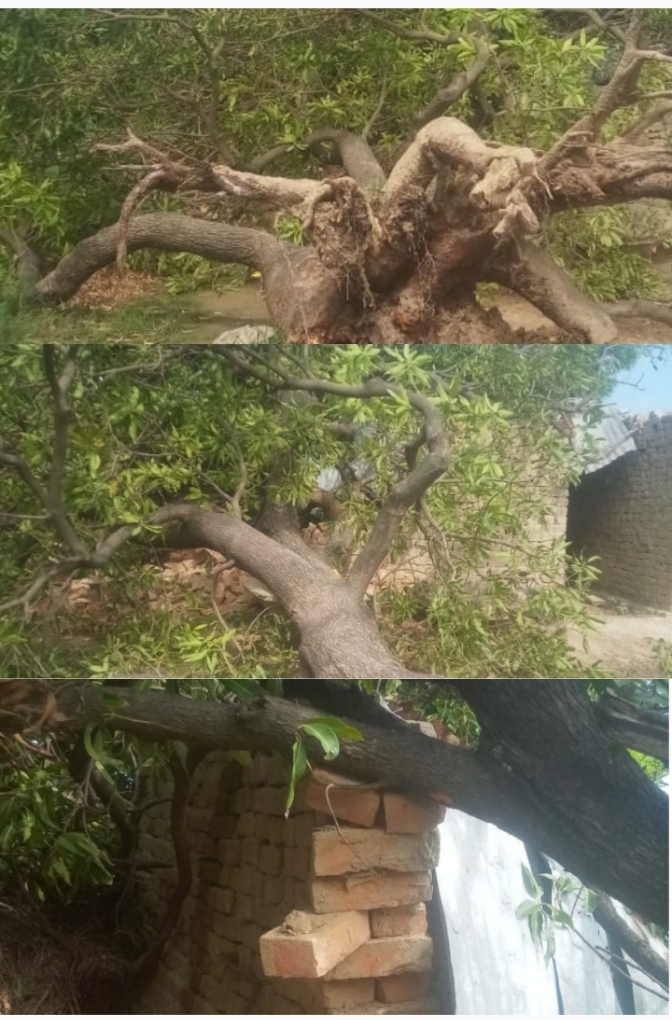 जंघई। जोगापुर मिश्रान गांव निवासी राहुल मिश्रा के घर के सामने पुराना आम का पेड़ था जो तेज आंधी में रात को गिर गया।आम का पेड़ ईंट की दीवार से बने छप्पर पर गिरी जिससे टिन का छप्पर गिर गया। छप्पर में बंधी गाय साफ साफ बच गई लेकिन उसमें रखा भूंसा एवं सामान दब गया। राहुल मिश्रा ने प्रधान एवं लेखपाल से मदद की मांग किया है ताकि पुनः गऊशाला का निर्माण कराया जा सके।